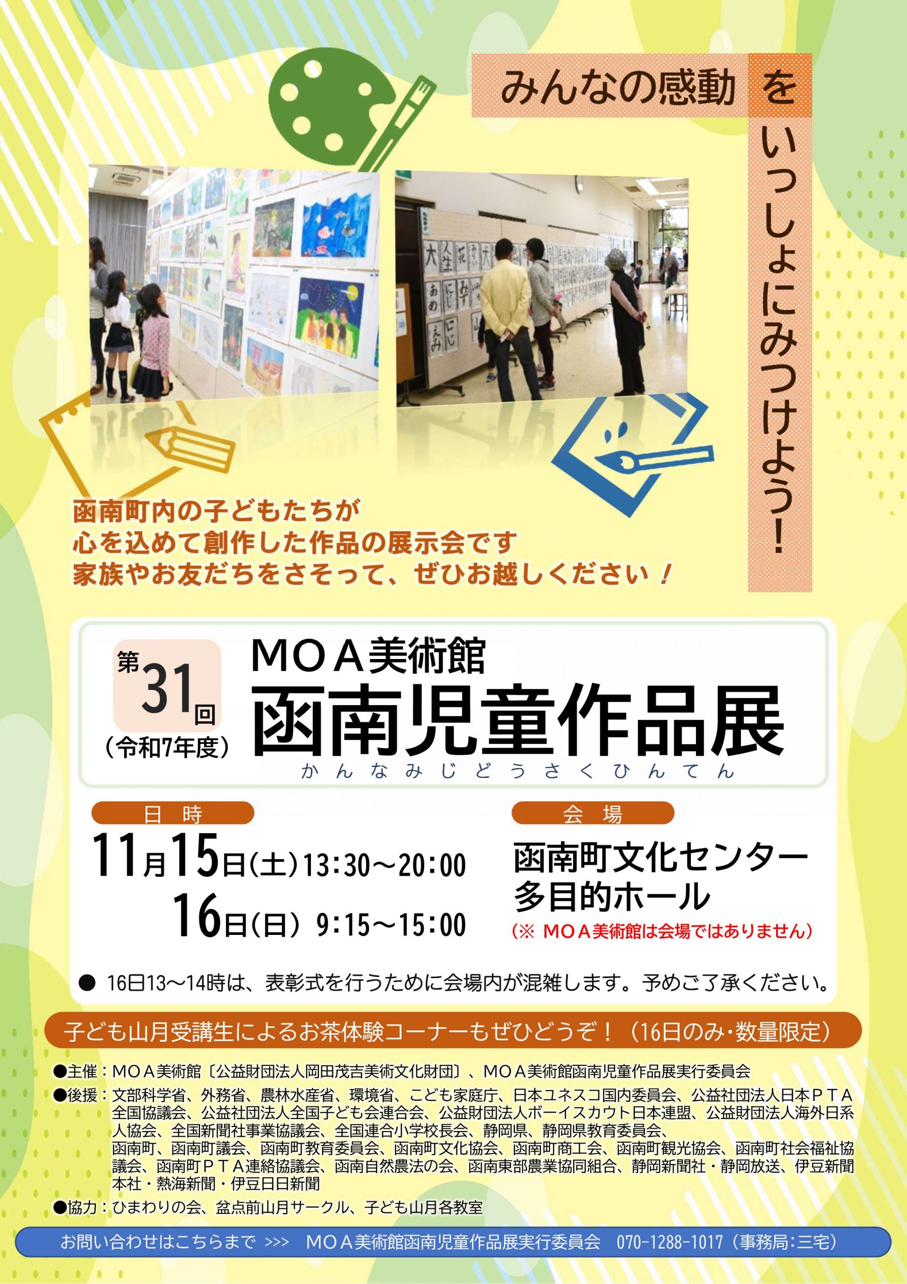 MOA美術館による児童作品展は、子供たちが興味や関心を持ったことを絵画や書写によって表現することで、感性や情操を養い、豊かな心を育てることを目的にさまざまな個人、団体と協力しながら開催されており、函南町は今年で第31回目をむかえます。