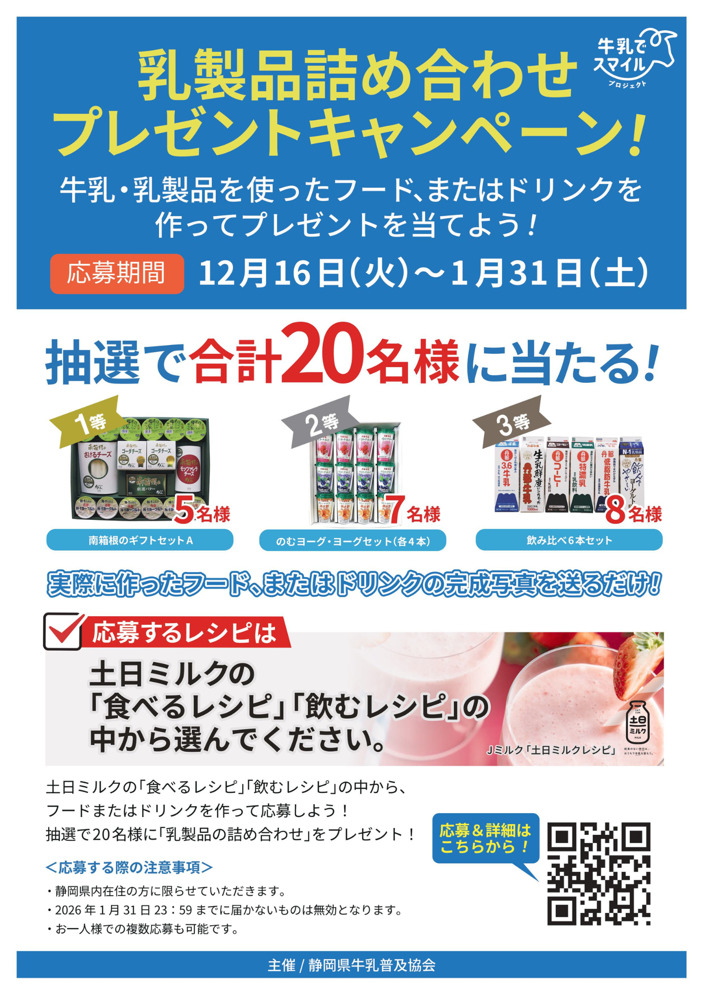 プレゼントの乳製品に、丹那牛乳の製品を採用いただいております。 興味のある方は是非ご応募してみてはいかがでしょう。 詳細は、チラシ及び下記URLの牛乳普及協会HPをご確認ください。